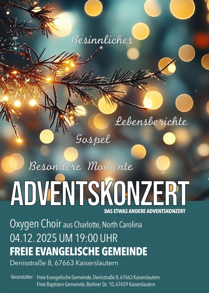 Freuen Sie sich auf einen festlichen Abend mit inspirierenden Chorklängen, der die Vorfreude auf Weihnachten entfacht. Das Konzert findet in Partnerschaft mit der FEG Kaiserslautern statt – erleben Sie Gemeinschaft, Musik und Besinnung in stimmungsvoller Atmosphäre.