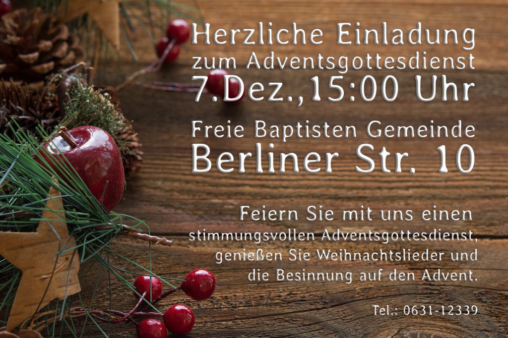 Am Sonntag, den 7. Dezember 2025, um 15:00 Uhr, möchten wir gemeinsam einen besinnlichen Adventsgottesdienst feiern. Der Gottesdienst findet in unseren Räumlichkeiten in der Berliner Straße 10 statt.